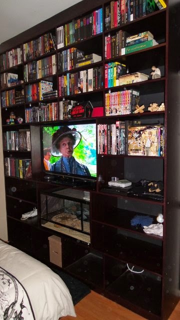 Last night my boys finished the shelves on Connor's wall unit and then the fun of sorting the books alphabetically began ~ I have always wondered how it feels to be a librarian!  Look how amazing it looks ...