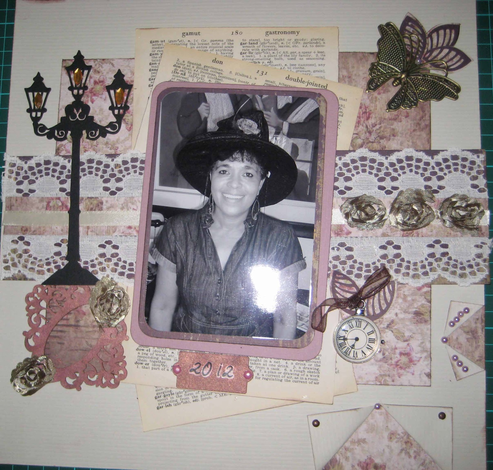 We had a break for dinner of lasagne, salad, malva pudding & custad and then all congregated back at our scrap tables.  We got working on our first page ~ Cheryl had a photo of each of us with the same hat on printed in black and white ~ and this is how our pages came out ... It is amazing how you can get the same "recipe" but each person's page comes out a little different ...